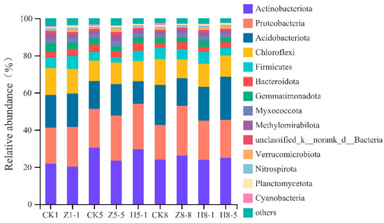 A total of 40 phyla, 122 classes, 284 orders, 440 families, 793 genera, and 1626 species of bacteria were identified in the test samples. At the phylum level (Figure 7), the average abundance of the test samples was greater than 1% for Actinobacteriota (24.87%), Proteobacteria (21.96%), Acidobacteriota (17.47%), Chloroflexi (12.13%), Firmicutes (5.28%), Bacteroidota (3.40%), and others, for a total of nine phyla. Compared with H8-1, the relative abundance of Acidobacteria of H8-5 increased by 31.05%, and that of Proteobacteria and Firmicutes of H8-5 decreased by 3.91% and 39.33%, respectively.