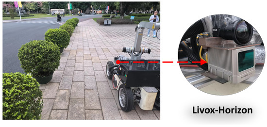 Data acquisition equipment and scene. In order to ensure that the LIDAR can acquire the height of the hedge from bottom to top, the installation height of the LIDAR in this study was about 0.8 m. In other working scenarios, the height of the LIDAR needs to be adjusted according to the height of the hedge.