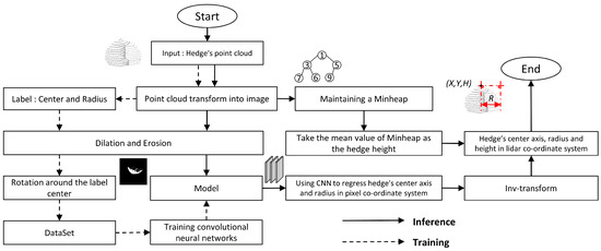 In this paper, given a point cloud of a hedgerow, we aimed to obtain its center axis , radius R, and height H. The center axis and height H were used to adjust the position of the trimming tool, and the radius R was used to determine the working range of the trimming tool. The overall framework of our approach is shown in Figure 2.