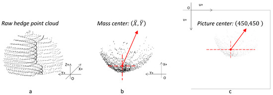 where (,) represents the coordinates of each pixel on the generated image. It should be noted that the range of 2.25 m from the center of mass was chosen based on the actual situation. The first thing was to make sure that the point cloud of the hedge did not exceed this range. Secondly, it was considered that no hedge point cloud would be outside this boundary when we rotate the image around the center of the label.