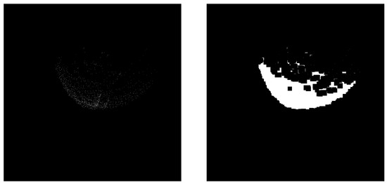 There is a problem with the images obtained from the above steps. Due to the sparsity of the point cloud, the percentage of pixels of the point cloud on the image was very small, and the distribution was relatively discrete. Intuitively, the point clouds occupied a small number of pixels after projection onto the image. From the statistics in our dataset, the largest cluster of point clouds had 8000 points, and the resolution of the image was 900 × 900. The number of pixels in the point cloud after projection was less than 1% of the pixels on the image, so we believe that it is a relatively small percentage. Therefore, we performed morphological operations on the image to make its features more obvious and to filter out some noise at the same time. There are corrosion and dilation operations in image morphological processing. The corrosion operation takes the minimum value in a neighborhood of each location as the output pixel value of that location, while the dilation operation is on the contrary. Therefore, for the sparse point cloud projection map, we used the operation of dilating and then eroding to increase its features and filter out the excess noise, as shown in Figure 4.