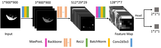 As shown in Figure 6, the input of the neural network is a single-channel image with a resolution of , while the input images of the more popular backbone are three-channel RGB images. To be able to use transfer learning to accelerate the convergence of the network model, we first expanded the image to three channels by a layer of convolution. At this point, the backbone and its pre-trained model, which are the mainstream in academia, were used to extract the features of the images. The output of the backbone is the feature layer of , and the visualization of some of its channels is shown in Figure 7. The maximum pool and convolution layer were used to further compress the feature layers, and the number and size of channels were compressed to the size of .