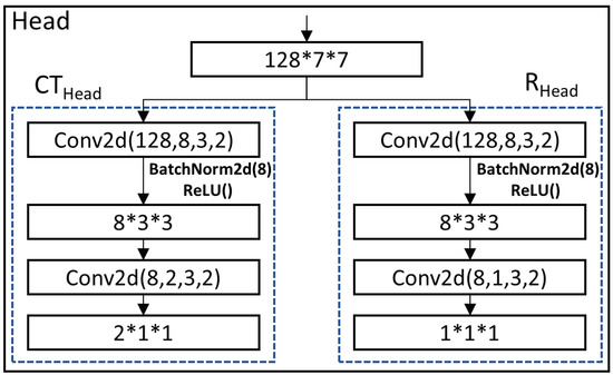 The head part of the model is mainly divided into two branches, namely and . In order to improve the overall performance of the network, we added batch normalization [27] and ReLU activation functions [28] in each layer. Among them, the output of is a -sized feature layer of two channels, and the two channels represent the X value and Y value of the center axis of the hedge, respectively. The output of is a -sized feature layer of a single channel, which was used to represent the radius R of the hedge. The structure of the head module is shown in Figure 8.