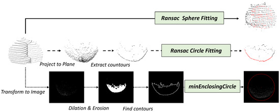 We performed experiments with other baseline methods in the test set. The baseline methods to obtain the three-dimensional information of hedges through point clouds are presented in Figure 10. In the first method, the sphere fitting algorithm was directly used to fit the original point cloud of the hedge. In the second method, the original green hedge point cloud was projected onto the XOY plane to obtain the plane point cloud, then the boundary points of the plane point cloud were obtained based on the normal estimation, and the circle was estimated by the circle fitting algorithm based on the boundary points. In the third method, firstly, the original point cloud was projected in the top view and transformed into an image. Next, the image was dilated and eroded. Then, the contour with the most boundary points was extracted. Finally, the outer circle of the contour was extracted using the function in OpenCV.