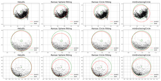 Visualization of the prediction of different methods. The red circle represents the predicted circle, and the green circle represents the ground truth. It is worth noting that the small green circle indicates the allowable error range, and if the center of the red circle can fall inside that circle, the prediction result meets the error requirement.