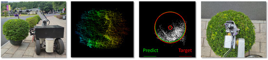 In the operation of the automatic trimmer, the trimmer needs to be placed directly above the hedge, so the height information at the top of the hedge and the center axis of the hedge need to be known. In addition, the hedge radius was used to determine whether the hedge needs to be trimmed because there are always some hedges that are not well grown and are too small to be trimmed. It is worth mentioning that if the LIDAR is mounted low, there may be a lack of information on the top of the hedge. This problem can be improved in two ways. Firstly, the hedge was localized at different measurement distances l. The localization results were converted to the world coordinate system, and their average value was taken as the final localization result. The other is to adjust the height h of the LIDAR mounting position to ensure that the LIDAR can detect the top of the hedge. Both l and h in the above two options need to be calibrated to the actual scene. In our experiments, the LIDAR was installed at a height of 0.8 m, and the data collected ranged from 1 m to 5 m.
