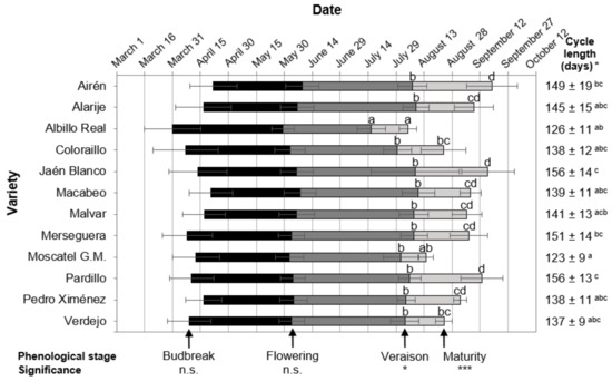Length and date of each phenological stage in the different varieties. Bars are three-year means, and error bars are standard deviations. Different colored bars indicate the length of each period between phenological stages. Cycle length shows mean value ± standard deviation. Different letters indicate statistical differences among varieties by Duncan test (ANOVA; *, p < 0.05; ***, p < 0.001; n.s., not significant).