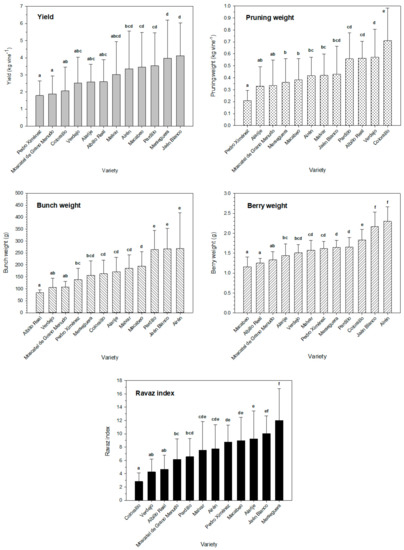 Yield components, pruning weight, and Ravaz index. Columns and error bars represent means and standard deviations, respectively, of 15 samples (five replicates each year). Different letters indicate statistical differences among varieties by the Duncan test (ANOVA, p < 0.001).