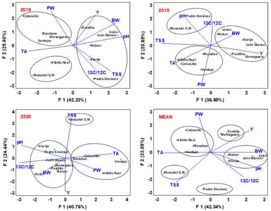 Taking into account the main variables measured—yield, berry weight, pruning weight, total soluble solids, total acidity, pH, and δ13C—a multivariate data analysis using PCA was performed to determine how these traits changed each year among different varieties when they were grown under drought conditions (Figure 4). Figure 4 shows the distribution of the varieties considering each year individually and jointly regarding these variables in the space defined by the PCA. As expected, both the effect of the environmental conditions during the vintage and the variety significantly influenced the results. However, the most relevant results are due to the way in which the different varieties were grouped and their distribution in the PCA analysis regarding the different parameters analyzed, which means that they responded in a similar way to water stress. During the three years of the study, the distribution of the varieties was analogous. Albillo Real, Coloraillo, Macabeo, and Verdejo were placed close to the axes corresponding to the total acidity and pruning weight. By contrast, varieties such as Airén, Alarije, Jaén Blanco, Malvar, Pardillo, and Merseguera approached the yield, berry weight, pH, and δ13C axes. These findings support the argument of using the mean values of the parameters analyzed considering the three years in the PCA analysis to evaluate the response of varieties to drought. According to the PCA performed with the mean values, the first two principal components explained 65.43% of all variance for the 12 varieties (42.34 and 23.09% for F1 and F2, respectively) and the cluster analysis enabled the varieties to be separated into five groups.