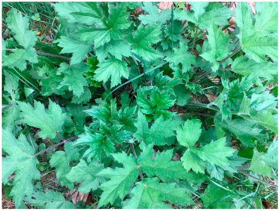 The common hogweed plant develops from rhizomatous roots with a furrowed stem and bristly hair, growing up to 2 m high (Figure 3A,B).