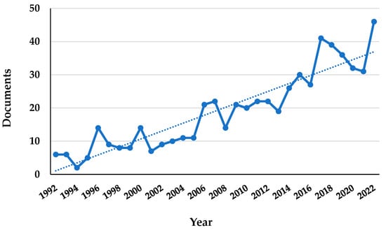 Increasing number of articles on H. sphondylium published from 1992 to 2022 (data retrieved from Scopus® database). The dashed line indicates the growing trend of the published articles.
