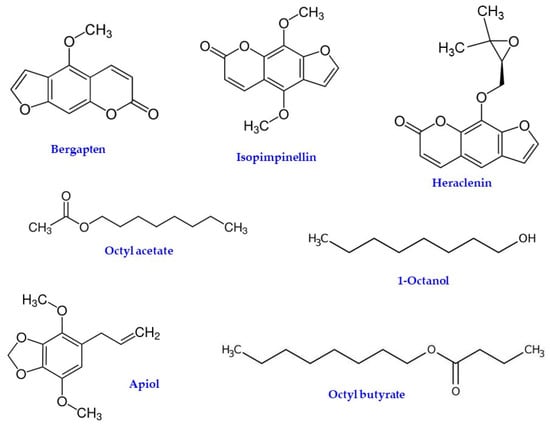 Phytochemical investigations on H. sphondylium showed the presence, in seeds and roots, of furocoumarins (bergapten, isopimpinellin, and heraclenin) [31,32,33] and essential oils [34] (Figure 7). The essential oils consist mainly of monoterpenes, sesquiterpenes, and phenyl-propanoid compounds [22].