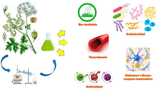 Apart from the traditional and innovative food uses of H. sphondylium, several biological activities (Figure 8) are reported in the literature regarding their non-food uses potentially being exploitable by the pharmaceutical and agri-food industries.