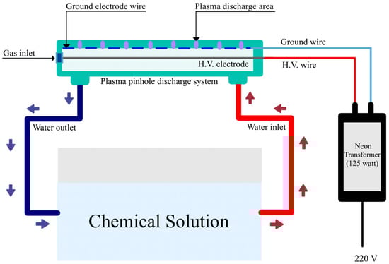 Plasma, which is the fourth state of matter, is a source of electrons, positively charged ions, radicals, gas atoms, molecules (in excited or basic states), and photons with a range of energies []. Plasma can occur in both natural phenomena on Earth (e.g., the aurora borealis and fire) and under laboratory conditions, by providing sufficient energy to excite gaseous molecules []. Plasma falls into the two categories of nonthermal plasma and thermal plasma. Nonthermal plasma has received considerable attention for applications in the agricultural sector []. Reactive oxygen and nitrogen species (RONS) generated from plasma are important factors that can enhance plant physiology and growth []. However, the nonthermal plasma technology in the form of gas is not sufficiently flexible for use in the agricultural sector due to the risk of plant surface damage []. Therefore, another form of plasma, which is more flexible than the gas form, is generated by exposing plasma to water; this is called plasma-activated water (PAW). Several researchers have proven the potential of PAW in various applications, including microbial inactivation [,], enhancement of seed germination [,], and plant growth improvement [,]. In addition to these applications in the agricultural sector, some research has used plasma-activated water as a source of nitrogen species. Graves et al. [] indicated that using air plasma to activate liquid solutions of organic material resulted in a reduction in pH and the addition of NO2−, NO3−, and H2O2. Therefore, the generated NO3− provides plants with accessible nitrate, and the nitrate increases linearly with the increase in power usage under all tested flow rates (i.e., 0.5, 1.25, and 2.0 L/min) []. In addition, Carmassi et al. [] investigated the effect of nonthermal plasma (NTP) technologies on hydroponic nutrient solutions and determined their effects on the growth and quality of baby-leaf lettuce (Lactuca sativa var. acephala Alef.). Their results prove that NTP treatment of the nutrient solution could improve the production and quality of baby-leaf lettuce grown in a hydroponic growing system (HGS). In hydroponics systems, the occurrence of algae leads to major problems, including intensive odors, a reduction in dissolved oxygen, nutrient deprivation, and a pH reduction in the system [,]. However, Date et al. [] showed that plasma-activated nutrient solutions could reduce algae growth to a greater degree than standard nutrient solutions.