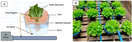 Globally, the production levels of lettuces such as Batavia, butterhead, red oak, red coral, and green oak have risen due to population increases and growing health concerns []. According to the Food and Agricultural Organization of the United Nations [], the global production of lettuce and chicory increased from 2015 to 2020 from approximately 26 to 28 million tons. Green oak (Lactuca sativa L.) is a leafy vegetable that is rich in nutrients such as fiber, folate, carotenoids, phenolic and antioxidant compounds, minerals, and various vitamins []. Although soil-grown lettuce is consumed worldwide, the risk of exposure to inorganic fertilizers and pesticides, which cause pollution and contamination, is high []. Hydroponics, an alternative method of growing lettuce, is an innovative agricultural technology that has been adopted in several countries. Due to the absence of soil, water is responsible for providing nutrients, hydration, and oxygen to plants or vegetables. Therefore, the risk of disease occurring due to organisms in the soil is low in such systems []. Furthermore, hydroponic systems are a highly popular technique for cultivating plants because they lead to improvements in growth, yields, income, profit, and the number of crops produced per year []. The fertilizer solution is an important factor in the functioning of hydroponics systems, and NO3-N is one of the main mineral elements that is usually derived from chemical fertilizers.