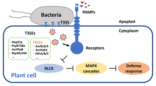 Bacterial pathogens secrete T3SEs targeting receptors and suppress host defense response. T3SS: type III secretion system; T3SEs: type III secreted effectors; TALEs: transcription activator-like effectors; PAMPs: pathogen-associated molecular patterns; RLCK: receptor-like cytoplasmic kinases; MAPK: mitogen-activated protein kinase.