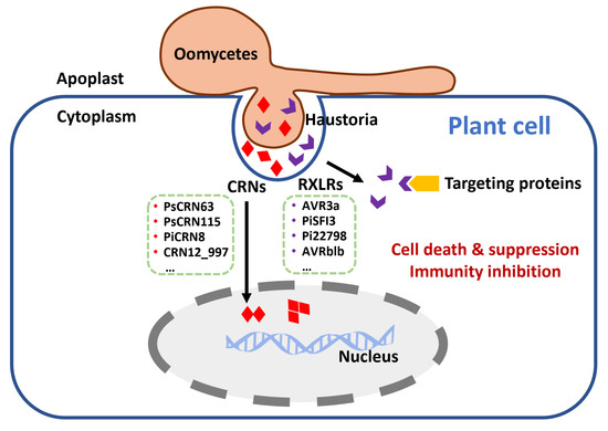 Cytoplasmic effectors need to be translocated from haustoria to the host cell. Two motifs—RXLR-dEER (X means any amino acid) and LFLAK-HVLV, referred to as CRN—are common and important cytoplasmic effectors in oomycetes [99,100] (Figure 2). N-terminal RXLR and CRN motifs play critical roles in the translocation of effectors [94]. RXLR and CRN effectors are very abundant in Phytophthora species. Almost 560 RXLR effectors and 450 CRN effectors are encoded by the P. infestans genome [94].