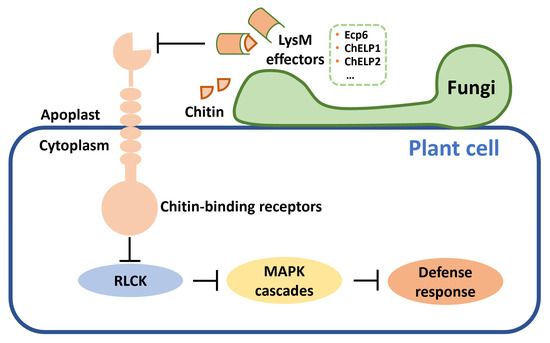 Fungal pathogens secrete LysM effectors blocking chitin sensing and suppress host defense response. LysM: lysin motifs; RLCK: receptor-like cytoplasmic kinases; MAPK: mitogen-activated protein kinase.