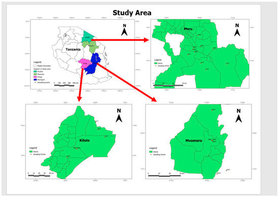 The study on the assessing of the tomato farmers’ knowledge and practices against whiteflies (Bemisia tabaci-Gennadius) in Tanzania was conducted from June to September 2022. The study used a semi-structured questionnaire with both open- and closed-ended questions. Purposive sampling was used to select regions that are core tomato producers in the country where Arusha (3.3869° S, 36.6830° E), Morogoro (6.8278° S, 37.6591° E), and Iringa (7.7681° S, 35.6861° E) were chosen as indicated in Figure 1. Then, purposive sampling was carried out to select one district from each region, where Meru (3.4470° S, 36.6741° E), Mvomero (6.2555° S, 37.5535° E), and Kilolo (7.8835° S, 36.0893° E) districts were selected, respectively. Finally, respondents who are tomato farmers were selected randomly from tomato farmers of the three districts, where 50 respondents were chosen per district, making a total of 150 tomato farmers. These respondents were a representative sample of 62,663 households reported to engage in tomato production in Tanzania mainland [21].