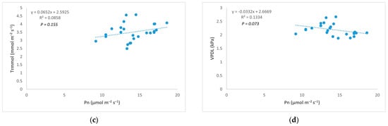 The gs was strongly positively linearly correlated with Pn. Ci and Trmmol had relatively weak positive linear correlations with Pn. In contrast, VPDL had negatively linear correlation with Pn (Figure 1).