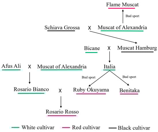 The white grape ‘Italia’ could sport into red grapes of the ‘Ruby Okuyama’ and ‘Benitaka’ varieties. The red grape ‘Okuyama Ruby’ and the white grape ‘Rosario Bianco’ were crossed to produce the red grape ‘Rosario Rosso’. The white grape ‘Muscat of Alexandria’ and the black-purple grape ‘Schiava Grossa’ were crossed to produce the black-purple grape ‘Muscat Hamburg’. The hybridization of ‘Bicane’ white grapes and ‘Muscat Hamburg’ black-purple grapes produced the white grape ‘Italia’ (Figure 1).