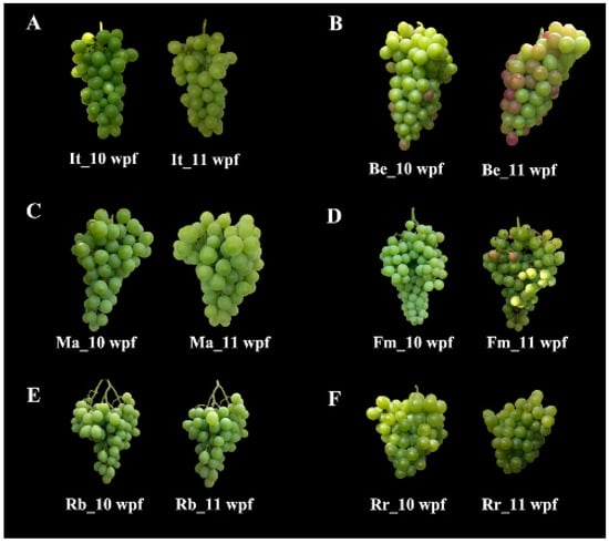 Fruit clusters of six varieties during véraison period (10 wpf and 11 wpf). (A) ‘Italia’ berries at 10 and 11 wpf; (B) ‘Benitaka’ berries at 10 and 11 wpf; (C) ‘Muscat of Alexandria’ berries at 10 and 11 wpf; (D) ‘Flame Muscat’ berries at 10 and 11 wpf; (E) ‘Rosario Bianco’ berries at 10 and 11 wpf; (F) ‘Rosario Rosso’ berries at 10 and 11 wpf.