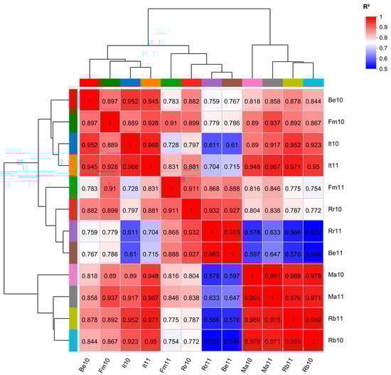 The Pearson correlation coefficient between It10 wpf and It11 wpf was close to 1, and It10 showed a positive correlation with It11. The Pearson correlation coefficients between It11 and Ma11 and between It11 and Rb11 wpf were also close to 1. The three white varieties of ‘Italia’, ‘Muscat of Alexandria’, and ‘Rosario Bianco’ showed good correlation (>0.8) at 11 wpf as well. The correlation coefficients between Ma10 wpf and Ma11 wpf and between Rb10 wpf and Rb11 wpf were close to 1, with ‘Muscat of Alexandria’ and ‘Rosario Bianco’ closely correlated. The correlation between the three red varieties of ‘Benitaka’, ‘Flame Muscat’, and ‘Rosario Rosso’ was low between 10 wpf to 11 wpf (Figure 3).