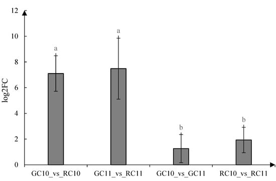 The log2FC value was used to compare the expression levels of VvMYBA1 in the comparisons of the GC10_vs_RC10 group and the GC11_vs_RC11 group. The results showed that log2FC >7, which means that the expression levels of the VvMYBA1 gene in the three red varieties were much higher than those in three green varieties. In the comparison of the GC10_vs_GC11 group, the log2FC value was only 1.26, and VvMYBA1 just reached the differential expression level (if the screening parameter was log2FC > 1.5, then it was not significant). In the comparison of the RC10_vs_RC11 group, the log2FC value was 1.95, and the expression of the VvMYBA1 gene was significantly different (Figure 4).