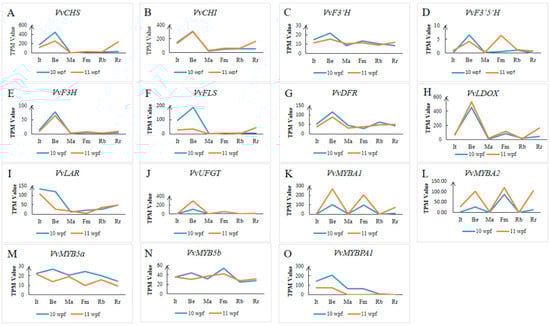 Leucoanthocyanidin dioxygenase (LDOX) and UFGT successively catalyzed the oxidation of colorless proanthocyanidins to form colored delphinidin or anthocyanins and the glycosylation of catalytically unstable anthocyanins to form various stable anthocyanins. The expression levels of the LDOX-encoding gene VvLDOX, the UFGT-encoding gene VvUFGT, and the regulatory genes VvMYBA1 and VvMYBA2 in the pericarps of the three red varieties were higher than those of the white varieties. Both the VvUFGT and VvMYBA genes were hardly expressed in the three white varieties during the véraison period (Figure 5H,J–L). The expressions of regulatory genes VvMYBA5a and VvMYBPA1 in the 10 wpf grape berry skins of each cultivar were higher than at 11 wpf (Figure 5M,O).
