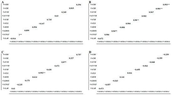 Correlation between anthocyanin synthesis structural genes and VvMYBA1 and VvMYBPA1 regulatory genes in two bud sport groups. (A) Correlation between anthocyanin synthesis structural genes and VvMYBA1 regulatory gene in ‘Italia’ vs. ‘Benitaka’ bud sport group; (B) ‘Muscat of Alexandria’ vs. ‘Flame Muscat’ bud sport group anthocyanin synthesis structural genes and VvMYBA1 regulatory gene correlation; (C) correlation between anthocyanin synthesis structural genes and VvMYBPA1 regulatory gene in ‘Italia’ vs. ‘Benitaka’ bud sport group; (D) ‘Muscat of Alexandria’ vs. ‘Flame Muscat’ bud sport group anthocyanin synthesis structural genes associated with VvMYBPA1 regulatory gene. ‘*,**’ represents the two groups of data reached a significant level, ‘*’ represents p < 0.05, ‘**’ represents p < 0.01.