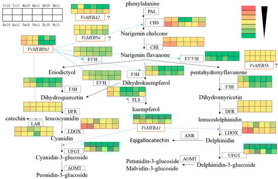 The relationships between the expression color scale of anthocyanin synthesis structural genes and regulatory genes in grape peels and the regulation of the MYBA gene. The blue dotted arrows represent the structural genes in the anthocyanin synthesis pathway regulated by the regulatory gene; the ‘?’ indicates that the regulatory mechanism of the regulatory gene is not yet clear; the green-to-red color scale means the TPM values showed an increasing trend.