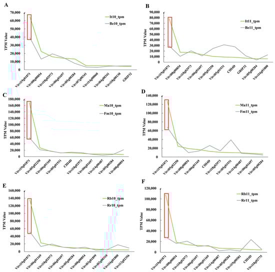 (A) ‘Italia’ ‘Benitaka’ TPM value almost top 10 of gene expression 10 wpf; (B) ‘Italia’ ‘Benitaka’ TPM value almost top 10 of gene expression 11 wpf; (C) ‘Muscat of Alexandria’ ‘Flame Muscat’ TPM value almost top 10 of gene expression 10 wpf; (D) ‘Muscat of Alexandria’ ‘Flame Muscat’ TPM value almost top 10 of gene expression 11 wpf; (E) ‘Rosario Bianco’ ‘Rosario Rosso’ TPM value almost top 10 of gene expression 10 wpf; (F) ‘Rosario Bianco’ ‘Rosario Rosso’ Top TPM value almost top 10 of gene expression 11 wpf. The green line represents the TPM values of white cultivars; the black line represents the TPM values of red and black cultivar.