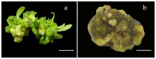 Adventitious shoots induced within 30 days: (a) adventitious shoots of callus differentiation; (b) browning callus. Bars = 1.0 cm.