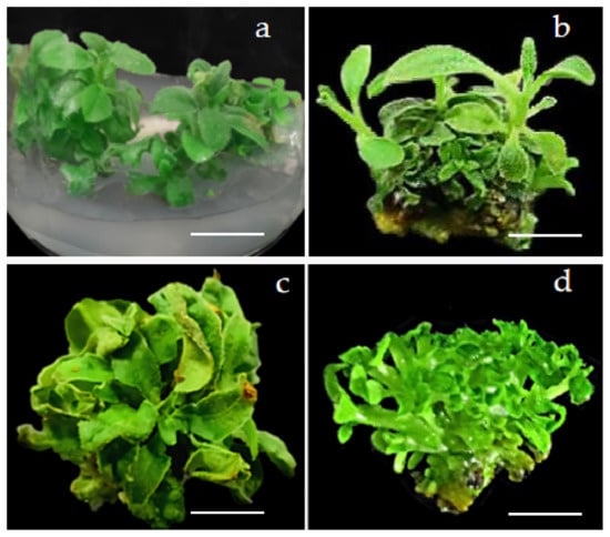Adventitious shoot proliferation of calluses on different medium combinations: (a) adventitious shoots with high proliferation coefficient containing green and normal leaves or (d) hyperhydric; (b) adventitious shoots with low proliferation coefficient containing green normal leaves or (c) yellow-green and abnormal leaves. Scale bars = 1.0 cm.