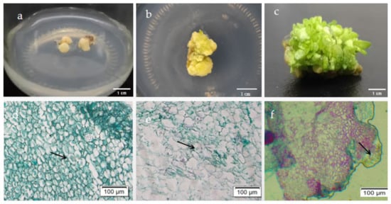 Cytological observation at three stages of the adventitious shoot formation from the calluses showed that white and fluffy calluses formed at the bases of the shoots after 20 days of culture (Figure 3a,d). The cells divided rapidly and were closely arranged. After 40 days of culture, the proliferation of the calluses was completed, and the cells continued to divide and expand (Figure 3b,e). After 60 days of culture, adventitious shoots differentiated from the calluses, which are clearly shown on the paraffin section (Figure 3c,f), suggesting that the shoot regeneration from the calluses was indirect.