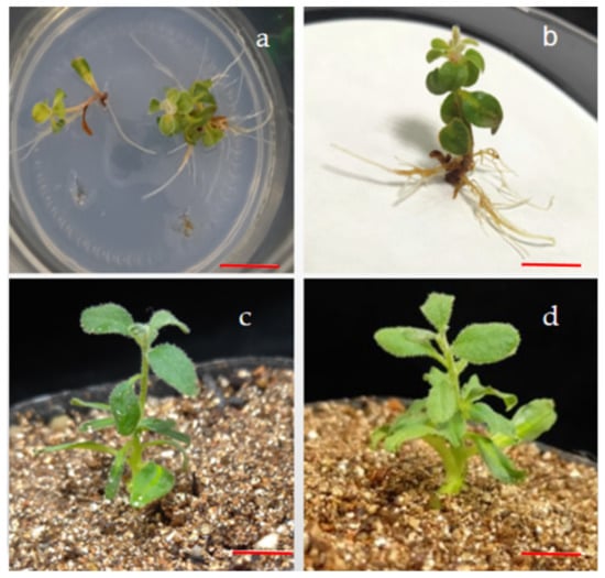 Roots and acclimatization of rooted plantlets: (a) roots in WPM medium after 30 days of culture; (b) rooted plantlets; (c,d) acclimatized plantlets from ex vitro rooting after 30 days. Bars = 1.0 cm.