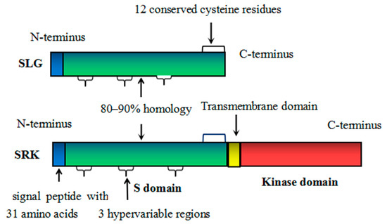 The first S-locus product to be identified was SLG, which encoded a secreted glycoprotein and was first isolated from cabbage. In some Brassica genotypes, the highest content of SLG was as much as 5% of the total stigma soluble protein [17]. The accumulation of SLG on the stigma was significantly correlated with SI [18]. The SLG was shown to increase during stigma development and to reach maximal levels simultaneously with the onset of the SI response [19]. The molecular weight of SLG was 57–65 kD, distributed in the cell wall and intercellular region of the stigma papilla cells [20]. The SLG proteins of different genotypes had different molecular weights. In B. oleracea, it consisted of 436 amino acids. The functional area comprised 405 amino acid residues. The N-terminal (1–181 amino acids) was hydrophobic and highly conserved (approximately 80%) with a signal peptide of 31 amino acids, which was responsible for guiding SLG into the cellular secretion system. The residues of 182–268 amino acids showed the greatest variation, with only 52% conservative. The C-terminal (269–436 amino acids) contained 12 completely conserved cysteine residues and 12 N-glycosylation sites, with the C-terminal approximately 78% conserved [20] (Figure 1). The Asn and n-GLCNAC on the glycosylation sites of Brassica oleracea were connected by N-glucoside bonds [21]. The arrangement of N-glycation sites of different SLG proteins was different. The relationship between the change of this structure and the specific pairing of the S allele product was still unclear [22]. Amino acid sequences of SLG was highly similar to SRK, with both having 12 conserved cysteine residues and three hypervariable regions [1]. The homology between SLG and SRK was approximately 80–90% in B. rapa, B. oleracea, and B. napus (Figure 1) [4]. It was once thought that SLG was only responsible for pollen adhesion, but now SLG diversity is interpreted as evidence of a role in SI [23]. Furthermore, the degree of S pollen rejection by SRK was correlating with the degree of amino-acid identity in S domain between SRK and SLG; the higher the identity, the stronger the rejection [8].