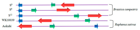 Schematic organization of S-locus genes. The arrow shaped boxes indicate S genes and the direction of transcription. The SLG is colored blue. The SCR/SP11 is colored green. The SRK is colored red. SCR/SP11 gene is located between SLG and SRK in Brassica campestris and Raphanus sativus Akokubi, while SRK gene is located between SLG and SCR/SP11 in Raphanus sativus WK10039. The direction of transcription of these genes were divergent in B. campestris and Raphanus sativus.