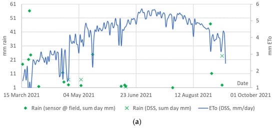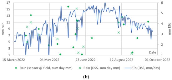 Figure 1 presents the reference evapotranspiration (ETo) and the rain for 2021 and 2022. The ETo values are those that were calculated from the DSS, while for rain, both the values from the DSS and those from the rain gauge that was installed at the vineyard are presented. The reason is that previous reports showed that, while the estimation of ETo by the DSS for the area where the vineyard was sited is adequate, rain was not sufficiently estimated. The results showed that from 15 March up to 8 September 2021, the DSS estimated 111 mm of rain while the sensor at the vineyard counted 240 mm. Additionally, from 15 March up to 24 September 2022, the DSS estimated 60 mm of rain while the sensor at the vineyard counted 156 mm. While estimates of daily reference evapotranspiration (ETo) in agricultural areas, via spatial interpolation of agrometeorological parameters that are monitored by a network of stations, generally provide good results [37,38], deviations between predicted and actual daily rainfall values is a common pitfall for such approaches [39]. As rainfall is a basic parameter of irrigation water balance, verification is recommended for rainfall data that are based on measurements which are made away from the field under consideration. For the present evaluation, the DSS model was run using the precipitation data from the rain gauge that was installed at the vineyard.
