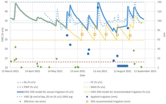 Monitored soil moisture and soil moisture generated by the DSS’s model, based on actual irrigation applications, recommended irrigation applications and effective rain, during 2021 (2021 GRO plot). The symbol v/v indicates that soil moisture is measured on volumetric basis.