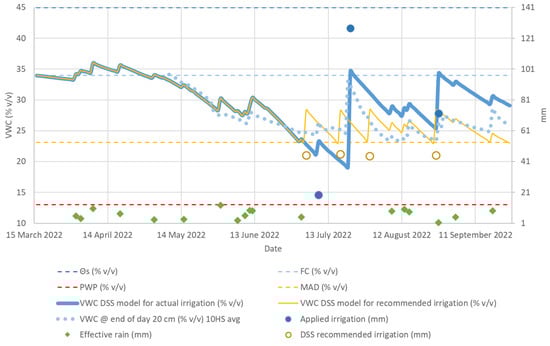 Monitored soil moisture and soil moisture generated by the DSS’s model, based on actual irrigation applications, recommended irrigation applications and effective rain during 2022 (2022 DSI plot). The symbol v/v indicates that soil moisture is measured on volumetric basis.