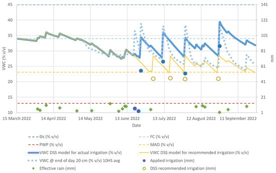 Figure 4 presents the water balance parameters (effective rainfall, irrigation recommendations, irrigation applications, soil moisture levels (Θs, FC, RAW and WP), the variation of the monitored soil moisture (soil moisture at the end of each day), of soil moisture as calculated by the DSS’s model (soil moisture at the end of each day) taking into account the actual irrigations and the corresponding variation in that the DSS’s recommendation would be strictly followed, during the irrigation period of 2022 for the plot irrigated using DSS’s recommendations (2022 DSI). It must be noted that although the intention was to apply the recommendations of the DSS, the time windows of water availability, caused some deviations regarding the time of irrigation events. The DSS recommended four (4) irrigation events which would lead to the application of 182 mm of water. Following the DSS, four (4) irrigations were applied (the first three of which could be considered as a set, as due to hydraulic problems of the irrigation system repairs were needed to complete the first irrigation). Furthermore, at the last irrigation, more water than what was recommended by the DSS was applied, due to a misunderstanding. For the period between 15 April and 24 September, the total precipitation was 131 mm, while the DSS team applied 272 mm of water. The values of MAE and RMSE where 3.05% and 3.70%, respectively. On 24 September 2022, 17.5 t of grapes ha−1 were harvested. The WPC for 2022 DSI plot, was calculated equal to 43.5 kg ha−1/m3 ha−1.