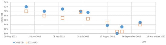 Measurements of LRWC (Figure 5), showed that during 2022, values for both DSI and GRO plots followed close routes, both at much higher of levels that would indicate water deficit [50,51].