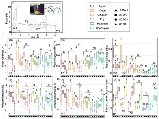 Textural properties of ‘Jiguan’, ‘Yindu’, ‘Qinguan’, ‘Fuji’, ‘Huaguan’, and ‘Cripps pink’ apple fruit stored at 25 ± 1 °C for 0, 20, 40, and 60 d. (A) Apple pulp puncture force-displacement curve; (B) flesh hardness measured by F2: mean force between 4 and 8 s; (C) flesh crispness measured by F3: average drop-off of force between 4 and 8 s; (D) flesh tightness measured by W3: area after 10 s; (E) pericarp firmness measured by F1: the max force; (F) pericarp resilience measured by W1: area from 0 to max force; (G) pericarp break distance D1: the distance from 0 to max force. DHA means days after harvest. Data were presented by a boxplot which consists of the most extreme values in the data set (maximum and minimum values), the lower and upper quartiles, and the median. In each plot, the capital letters above the symbols indicate significant differences (p < 0.05) between six cultivars, and the lowercases indicate significant differences (p < 0.05) between different storage times.