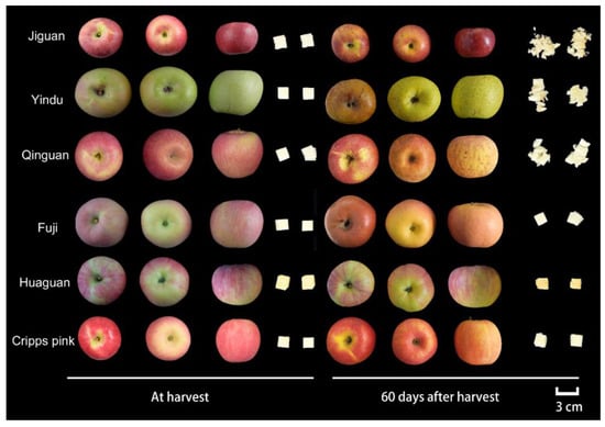 Appearance of ‘Jiguan’, ‘Yindu’, ‘Qinguan’, ‘Fuji’, ‘Huaguan’, and ‘Cripps pink’ apple fruit stored at 25 ± 1 °C for 0 and 60 d. The pulp of 15 × 15 × 15 mm cube represents the shape of the apple pulp after being pressed by 75 N force using a TA-XT plus texture analyzer (Stable Micro Systems Ltd., Godalming, UK).