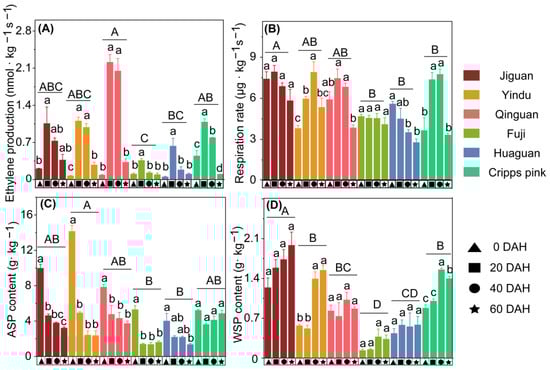 Ethylene production rate (A) and respiration rate (B), acid-soluble pectin (ASP) content (C), and water-soluble pectin (WSP) content (D) of ‘Jiguan’, ‘Yindu’, ‘Qinguan’, ‘Fuji’, ‘Huaguan’, and ‘Cripps pink’ apple fruit stored at 25 ± 1 °C for 60 d. Data are presented as mean ± standard error (SE) from three biological replicate assays; in each plot, the capital letters above the symbols indicate significant differences (p < 0.05) between six cultivars, and the lowercases indicate significant differences (p < 0.05) between different storage times.