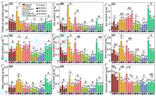 Cell walls material (CWM) yields and its neutral sugar compositions content of ‘Jiguan’, ‘Yindu’, ‘Qinguan’, ‘Fuji’, ‘Huaguan’, and ‘Cripps pink’ apple fruits stored at 25 ± 1 °C for 60 d. (A) Yields of CWM; (B) glucose (Glc); (C) xylose (Xyl); (D) rhamnose (Rha); (E) galactose (Gal); (F) arabinose (Ara); (G) mannose (Man); (H) fucose (Fuc); and (I) galacturonic acid (Gal acid). Data are presented as mean ± standard error (SE) from three biological replicate assays. In each plot, the capital letters above the symbols indicate significant differences (p < 0.05) between six cultivars, and the lowercases indicate significant differences (p < 0.05) between different stored times at each apple cultivar.