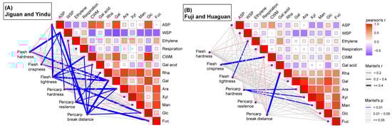 Correlation analysis for texture properties, physiological indicators of ‘Jiguan’ and ‘Yindu’ (A) and ‘Fuji’ and ‘Huaguan’ (B) apple fruits during postharvest. The Mantel test was used for the six texture properties and thirteen physiological indicators and Pearson for the thirteen physiological indicators. The size and color of the square represent the correlation coefficient of indicators for Pearson. The coarseness and color of the line represent the correlation coefficient of indicators for the Mantel test.
