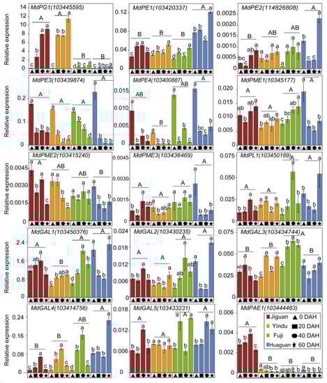 To identify cell wall-related and expressed genes in the fruit tissue, RNA-Seq data released by Busatto et al. [35] were downloaded from the NCBI. The data of the ‘Golden Delicious’ and ‘Fuji’ fruit that were stored for 14 and 21 d at room temperature were used. Based on their normalized expression values (RPKM, reads per kilobase of exon per million mapped reads), a set of cell wall-related genes (within the gene families encoding PG, PE, PL, PME, α-AF, β-GAL, and PAE) expressed in fruit tissues during postharvest storage (RPKM > 10) was selected. Their expression in ‘Jiguan’, ‘Yindu’, ‘Fiji’, and ‘Huaguan’ apples at 0, 20, 40, and 60 DHA was quantified using qRT-PCR.