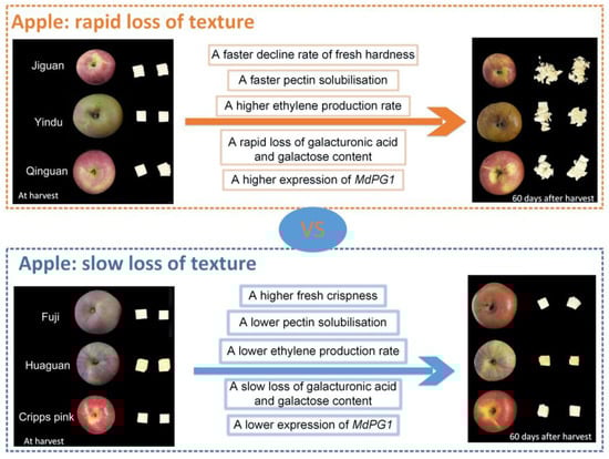 The changes in the texture properties and cell wall sugar components of six different cultivars of apple fruit were compared, and the correlation between them was analyzed during storage. The apple cultivars with rapid texture loss (‘Jiguan’, ‘Yindu’, and ‘Qinguan’) showed a faster loss in flesh hardness and crispness, and a higher level of flesh tightness and pericarp break distance, than the cultivars with slow texture loss (‘Fuji’, ‘Huaguan’, and ‘Cripps pink’) (Figure 7). Among the monosaccharide components, the galactose content showed the closest association with the texture properties, which indicated that the rapid loss of galactose could be the reason for the rapid loss of apple texture. The rapid loss of galacturonic acid content and the expression level of MdPG1 were higher in the cultivars with rapid texture loss than in the cultivars with slow texture loss. In summary, the cell wall neutral sugar composition changes may be attributed to the texture loss in apple fruits during storage. These results may provide insights into understanding the textural properties of apple cultivars and developing more effective methods for the storage of high-quality apples.
